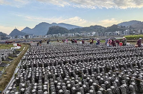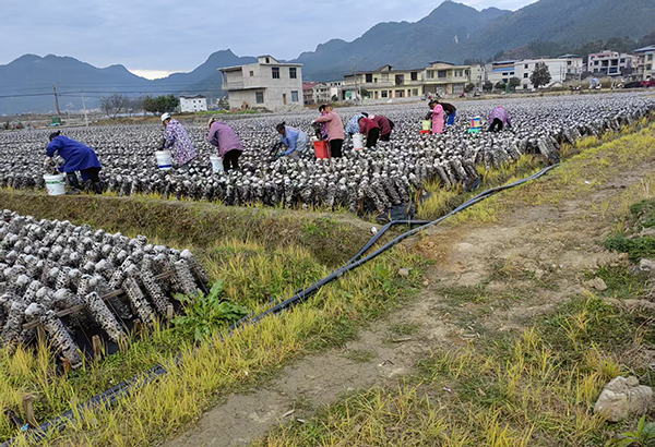 基地内,60余名工人正穿梭于菌棒矩阵之间,动作娴熟地进行采摘。他们手指翻飞,精准地将达到采收标准的木耳摘下,随即装入身旁的桶中。不一会儿,一桶桶沉甸甸、黑黝黝的木耳便被集中起来,运往晾晒场。搬运、摊晒……各个环节衔接有序,每个人的脸上都洋溢着收获的笑容,共同构成了一幅动人的冬日丰收图。