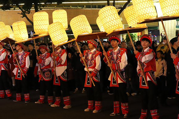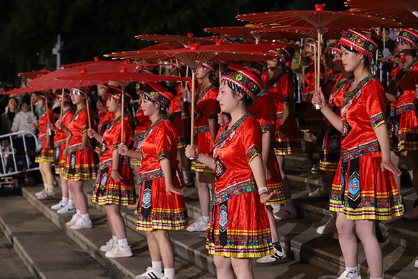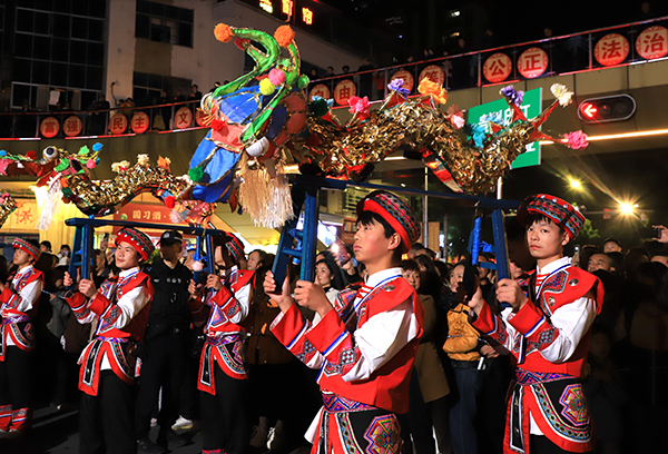 在环形天桥互动点位,锣鼓声渐次急促,队员们两两配合,头顶板凳龙来回穿梭、上下舞动,灵动翻飞如活龙跃动,腾挪似惊雷破阵,引得市民游客纷纷驻足欢呼、拍照留念,快门声与喝彩声交织成一片热闹盛景。“板凳龙是我们印江的宝贝,夜里表演更有氛围!”板凳龙表演领队杨恩慧对着镜头介绍说,“希望非遗借网络东风,走出大山,让更多人感受印江的非遗魅力。”