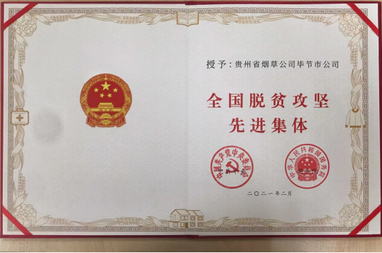 2021年,毕节烟草荣获中共中央、国务院授予的“全国脱贫攻坚先进集体”殊荣。