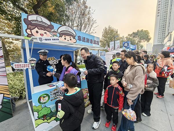 现场游戏互动设置了交通安全套圈、道路交通标志识别、交通安全知识快问快答、酒后距离感测试、车速射击游戏、安全出行扔沙包、emoji猜猜猜九个项目,由来自各市(州)的宣传教官现场引导,通过互动增强群众对道路交通安全法律法规的理解。