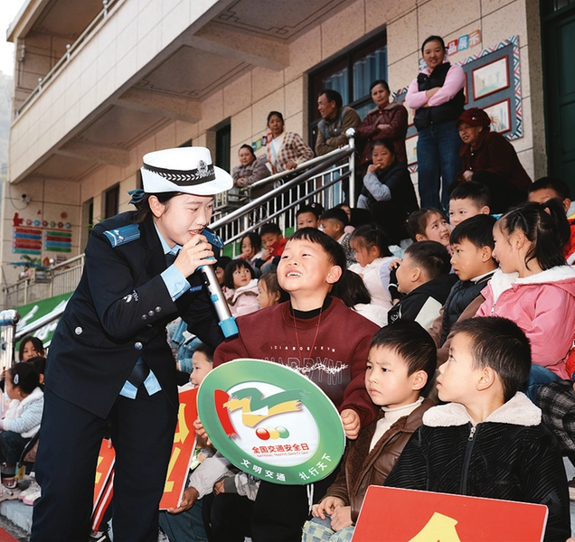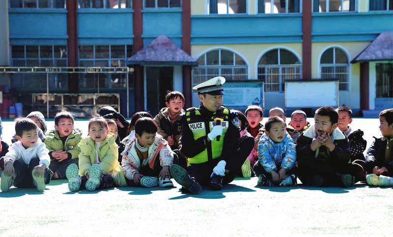 在织金县后寨中心幼儿园,操场上此起彼伏的童声成为最动人的旋律,“警察叔叔,我知道!过马路要走斑马线!”面对民警的提问,孩子们纷纷举起小手抢答;