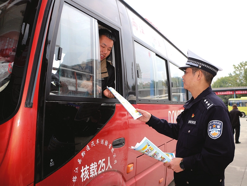 在榕江县汽车站,宣传人员通过案例讲解、资料发放、现场咨询等形式,切实提升司乘人员及过往群众的交通安全意识与自我防护能力。 何立波 郑德高 摄