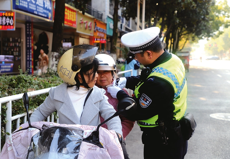 江口县公安局交警大队民警辅警向过往群众讲解规范佩戴安全头盔的正确方法。蒋艳 摄