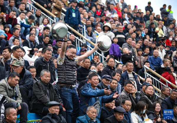 “村BA”现场一名观众敲着脸盆加油助威(2023年3月26日)。新华社记者刘续 摄