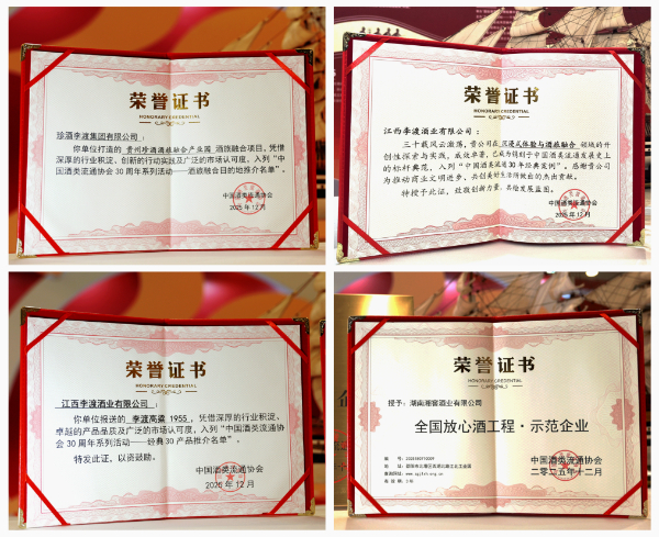 珍酒李渡在评选中获得六项大奖:珍酒李渡集团董事长吴向东被授予“中国酒业30年重要贡献”荣誉称号;贵州珍酒酒旅融合项目入选“中国酒类流通协会30周年系列活动——酒旅融合目的地推介名单”;大珍·珍酒被评为“酒业未来30产品”;李渡酒业入选“中国酒类流通30年经典案例”;李渡高粱1955入选“中国酒类流通协会30周年系列活动——经典30产品推介名单”;湘窖酒业荣获“全国放心酒工程·示范企业”荣誉称号。