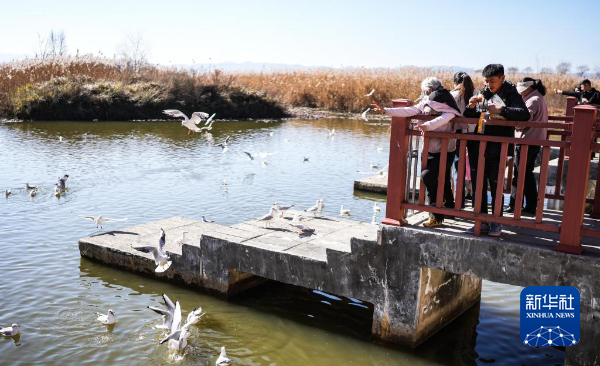 12月12日,市民在贵州草海国家级自然保护区观赏越冬候鸟。