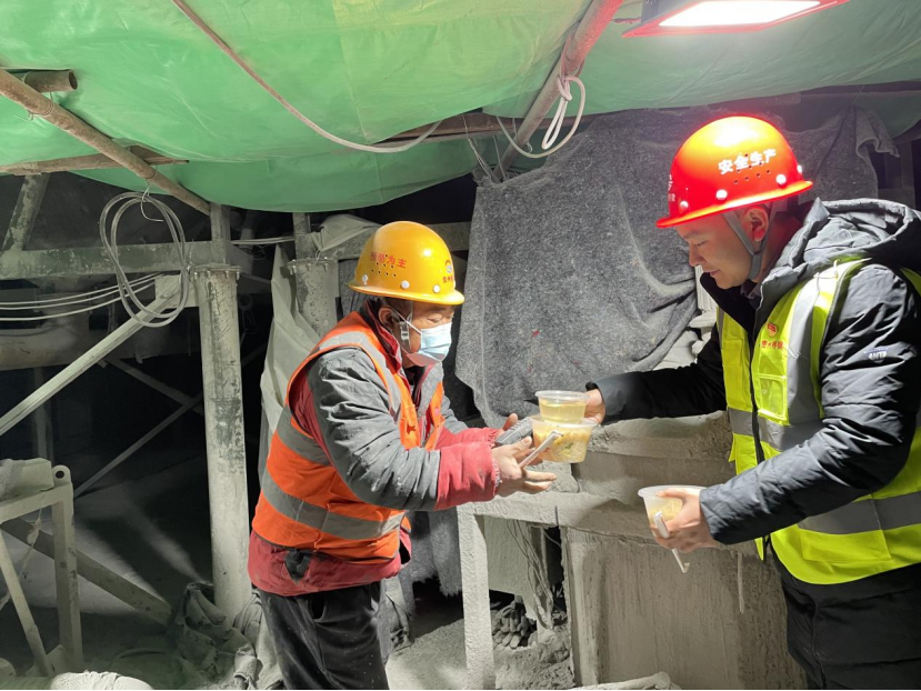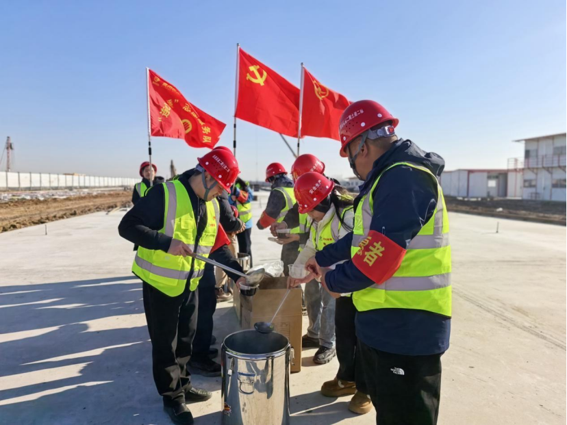 党建带工建团建,凝聚攻坚合力。L2标党支部创新实施“党建带工建团建”三联机制,随着此次主题党日活动的启动,“冬送温暖”已形成固定排班:项目部组织青年服务队每周为夜间值班人员派送一次爱心宵夜,每天工区厨房为夜间施工人员准备泡面、炒饭等宵夜,并固定配备姜茶、豆浆等热饮,确保“气温降,职民工心中的温度不降”。这种常态化服务背后,是一整套精准的需求响应机制。党支部深入工区与工区管理人员开展谈心谈话、随时召开“思享会”,主动询问需求和实际困难,帮助解决冬季施工难题。