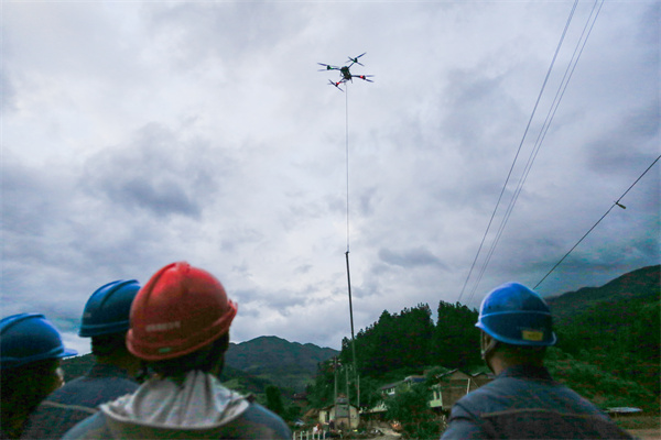 南方电网贵州都匀供电局在都江镇10千伏堂辉线里捞支线抢修现场,抢修人员用重载无人机调运抢修设备和物资。(魏洪明 摄)