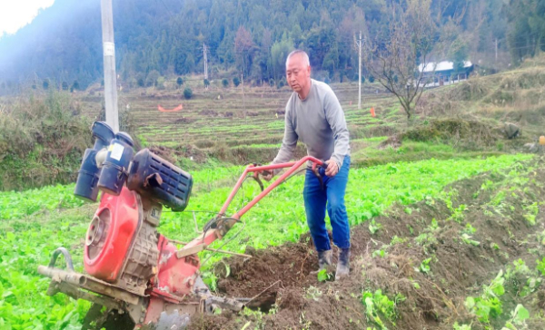 天桥镇漆坪村,平均海拔1200米,多为山地,无平坝,到县城约2小时车程,属于典型的偏远山区,在这里,回访组偶遇烟农老李,他60上下的年纪,皮肤黝黑,人却很精神,正忙着用微耕机翻犁土地。看到回访组一行,他将微耕机熄火停下,双手轻轻交叉拍打了几下,试着努力擦去手掌内外的尘土,笑呵呵的对着天桥收购点技术人员说到:“肖经理,你看我翻犁的土地质量如何?这台微耕机还是5年以前你给我申请补贴下来的,用起来很顺手,特别适合在我们这些山区地方使用,比以前用传统的耕牛犁田效率高多了,而且还省去了平时养牛的很多成本。”