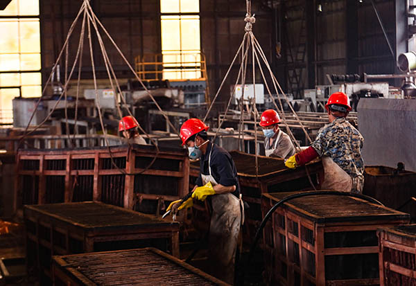 4月13日,工人在贵州省铜仁市松桃苗族自治县一家电解锰企业生产车间生产锰。(龙元彬 摄)