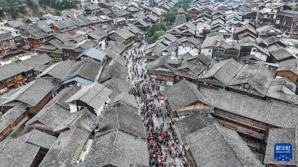12月20日,游客与侗族群众在肇兴侗寨正门欢庆侗年(无人机照片)。新华社记者 陶亮 摄
