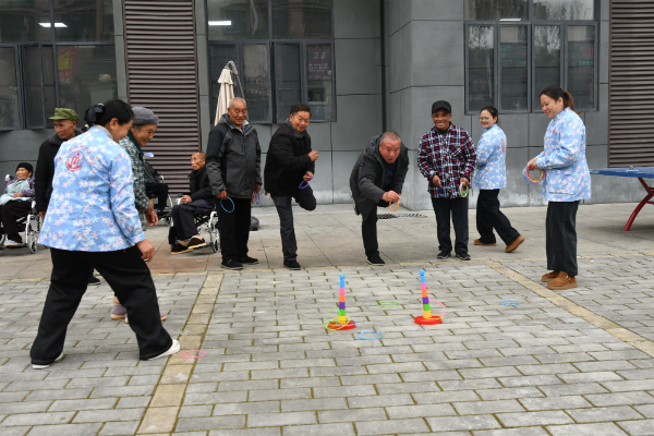 罗甸县老年养护院的老人们在玩套圈游戏。