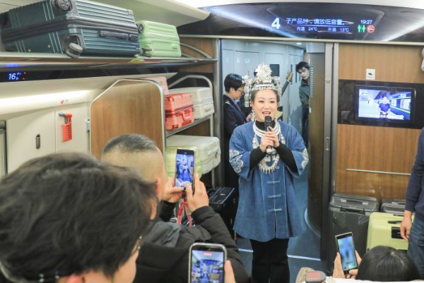 随着列车缓缓驶入贵阳北站,更多的惊喜还在上演。志愿者早已在出站口等候,为远道而来的客人送上礼物与祝福。与此同时,芦笙悠扬、舞步翩跹,精彩的民族歌舞表演赢得了旅客的阵阵掌声。