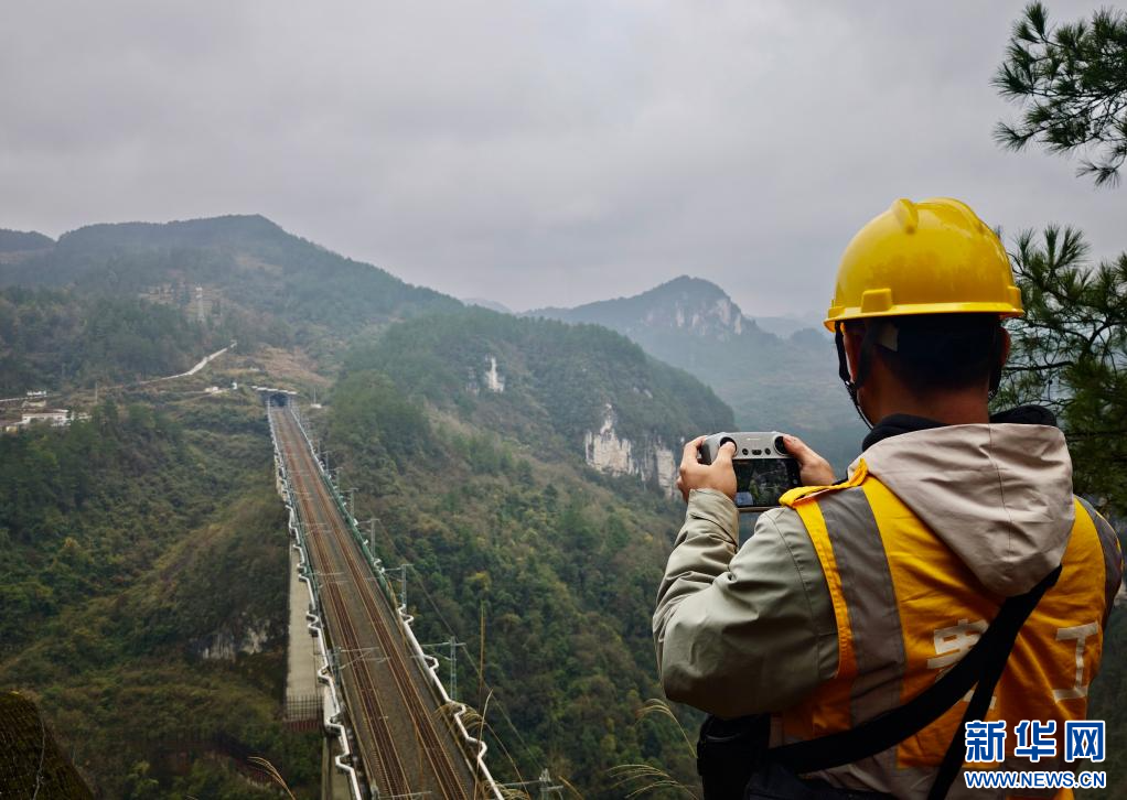 图为贵阳工务段危石工区青年职工正在使用无人机巡检桥梁。