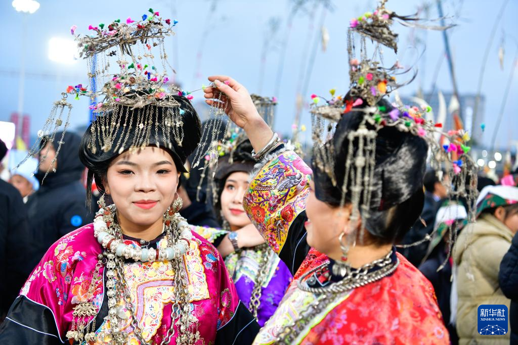 1月2日,侗族群众在第四届贵州“村超”开幕式现场整理头饰。新华社记者 杨文斌 摄