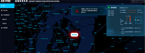 自2025年11月13日该系统在贵州空管分局试用以来,这支科技“尖兵”迅速发挥实效,展现硬核实力:2025年11月25日至30日,受辐射降温影响,贵阳机场连续6天出现霜天气,创连续结霜日数之最,冰霜探测系统凭借敏锐的感知能力,精准捕捉每一轮霜情的生成、发展及消散全过程,实时推送霜情数据,为早出港航班除霜作业提供科学依据;2026年1月2日至3日,新一轮强冷空气来袭,系统通过实时监测识别积冰过程,精准计算毫米级积冰厚度,为航空气象人员对凝冻天气的监测预警提供有力客观参考,有效降低了凝冻天气导致的航班延误、备降等风险。(陈义义)