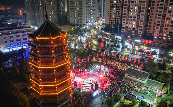 2025年12月30日,德江玉溪河畔,西麓阁广场灯光璀璨、人潮如织。