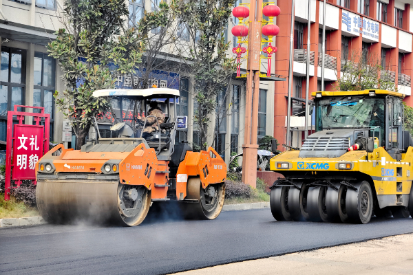 在城南环路过境段改造施工现场,机械轰鸣声此起彼伏,一派热火朝天的攻坚景象,摊铺机匀速前行,滚烫的沥青混合料倾泻而出,在路基上迅速铺开;压路机来回反复碾压,沥青混合料运输车有序穿梭,施工人员分工协作,紧盯摊铺质量与进度。