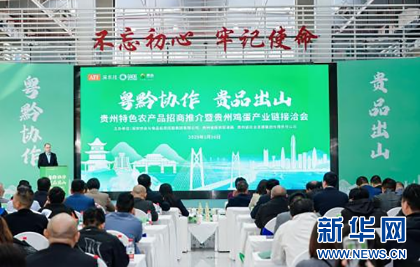 新华网贵阳1月16日电 16日,“粤黔协作·贵品出山”贵州特色农产品招商推介暨贵州鸡蛋产业链接洽会在深圳举行。此次活动由深圳农业与食品投资控股集团有限公司、贵州省农业发展集团有限责任公司、贵州省投资促进局联合主办,以产业对接为纽带,以合作共赢为目标,搭建起粤黔两地农产品产销对接的坚实桥梁。