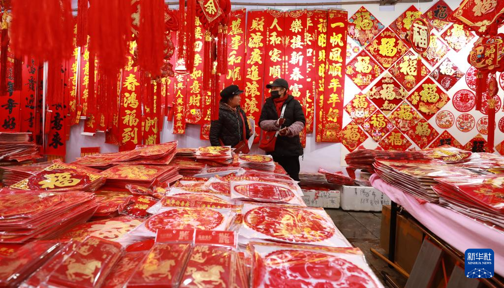 春节临近,各地年货市场年味渐浓,人们忙着选购春节饰品,迎接新春佳节。