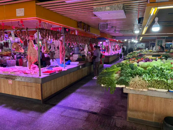 1月21日清晨的旭东路农贸市场摊位上,白菜、青椒、萝卜等新鲜蔬菜码放整齐,猪肉、禽蛋、粮油等生活物资一应俱全,电子显示屏实时公示着食材溯源信息与价格,让市民买得放心。