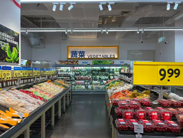 在沃尔玛超市中大国际店,各类新鲜蔬果五彩斑斓、整齐排列,令人目不暇接。