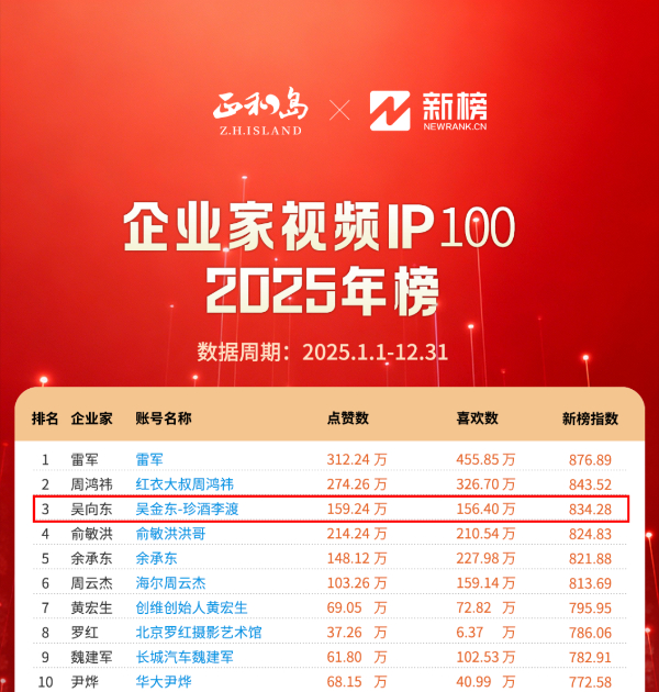 1月22日,正和岛联合新榜发布2025年度《企业家视频IP100榜单》。珍酒李渡集团董事长吴向东视频号“吴金东—珍酒李渡”,凭借广泛关注度和影响力,位列榜单第三。排名前五位的企业家分别是雷军、周鸿祎、吴向东、俞敏洪、余承东。