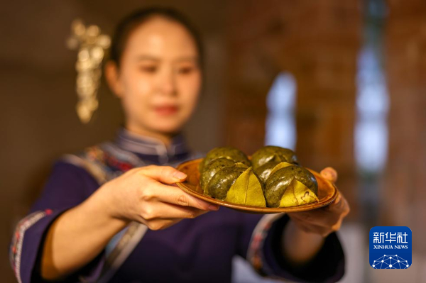1月23日,在贵州省铜仁市玉屏侗族自治县新店镇老寨村,村民展示蒸制好的菜菜粑。新华社发(胡攀学 摄)