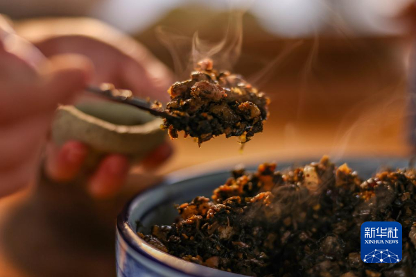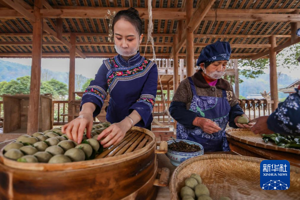 1月23日,在贵州省铜仁市玉屏侗族自治县新店镇老寨村,村民在蒸制菜菜粑。新华社发(胡攀学 摄)