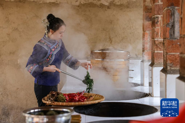 1月23日,在贵州省铜仁市玉屏侗族自治县新店镇老寨村,村民在煮蒿菜准备制作菜菜粑。新华社发(胡攀学 摄)