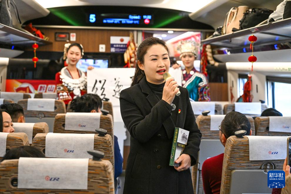 1月26日,宣讲员在遵义开往延安方向的G3360次列车上给旅客讲红色故事。新华社记者 杨文斌 摄