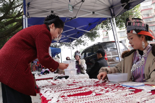 “现在也准备过年了嘛,然后我们苗家姑娘也比较喜欢跳月,比较喜欢戴这些银饰,今天生意还可以,都卖了好几件了。”银饰摊主平玉英说。(周忠能 安金山 欧圣兵)