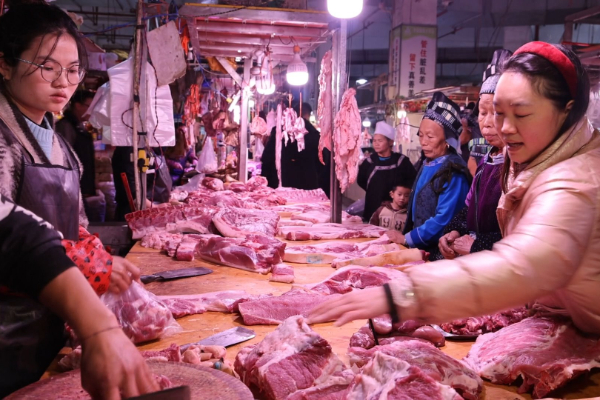 “准备过年了,赶场天我们多准备点肉,然后价格也便宜,五花肉12元一斤,腿子猪肉这些10块一斤,然后今天4个猪都不够卖。”猪肉摊主吴桂花说。