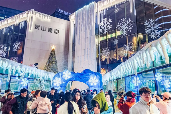 寒冬时节,海豚广场6楼的室外中庭,一场“冰曜之境”主题场景亮相——漫天飘散的“雪花”、20M高的极地冰川瀑布奇观与正在拍照打卡的人群们构成了一幅其乐融融的画面,这套打卡装置,以季节限定收获大量市民的喜爱。