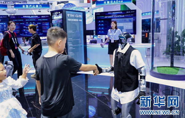 数博会期间观众在电信展厅与机器人互动。(受访对象供图)