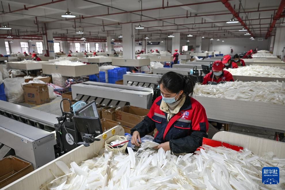工人在贵州锦屏经济开发区羽毛球生产基地分级生产羽毛球所需的鹅毛(2026年1月22日摄)。新华社记者 杨文斌 摄