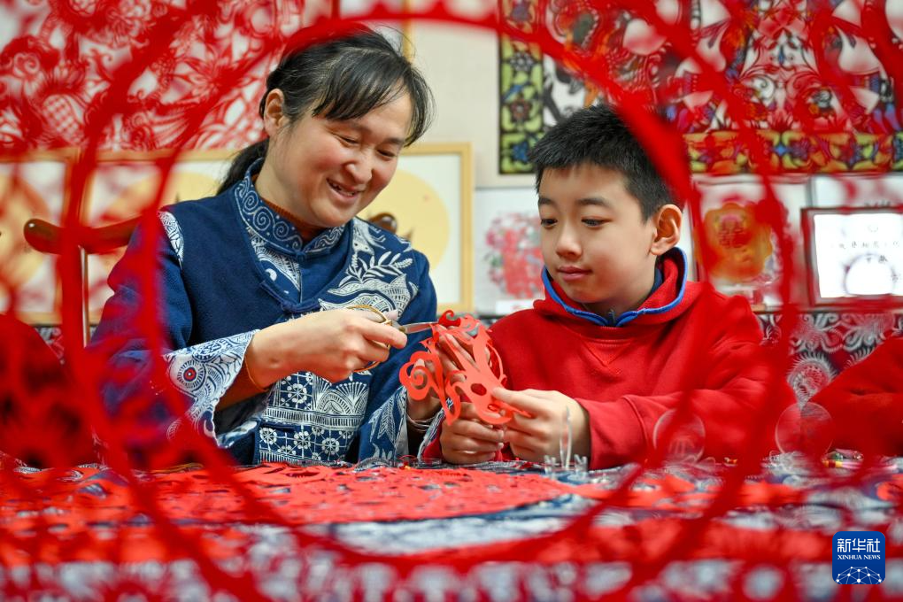 2月3日,在贵州省贵阳市省府路小学,学生在老师的指导下创作马年主题剪纸作品。