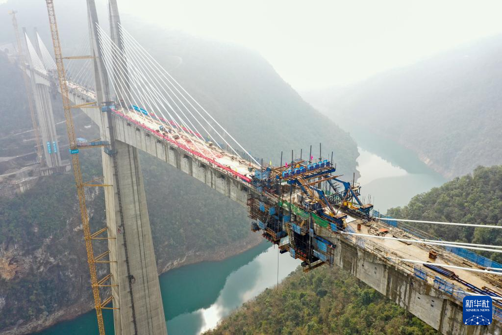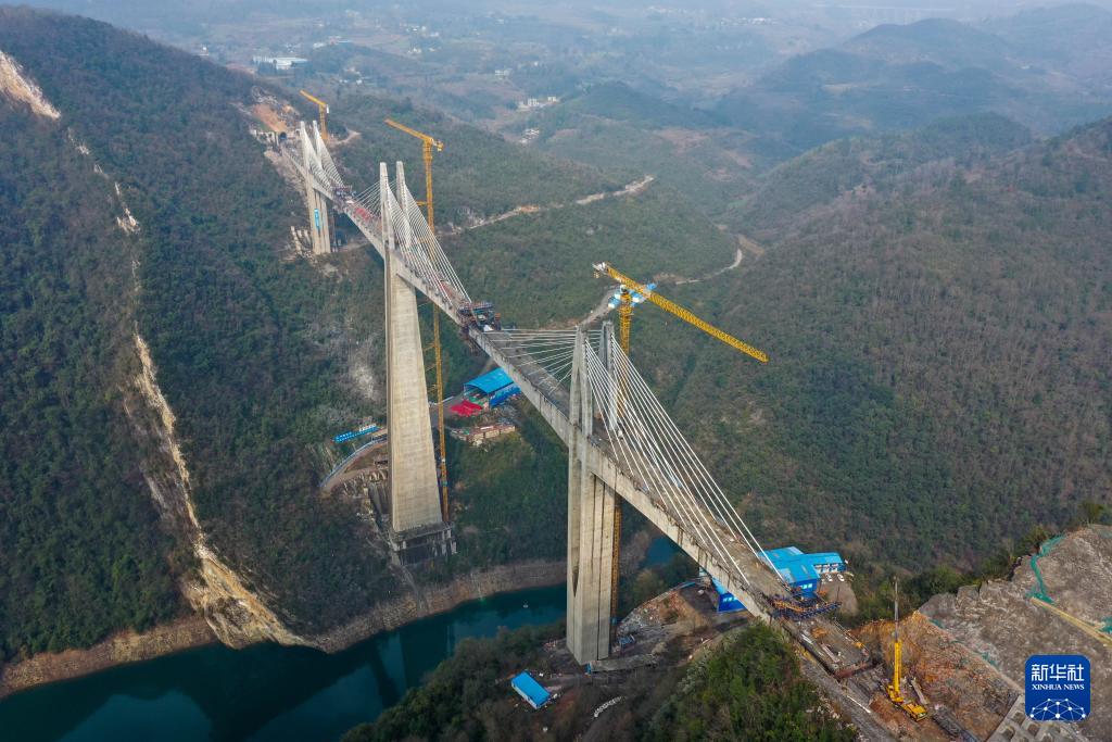 2月6日拍摄的合龙后的瓮马铁路湘江特大桥(无人机全景照片)。新华社发(肖伟摄)
