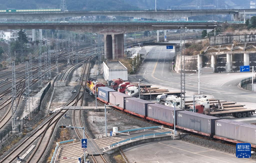 2月15日,一列满载集装箱的中欧班列在贵阳国际陆港都拉营站等待发车。新华社发(袁福洪 摄)