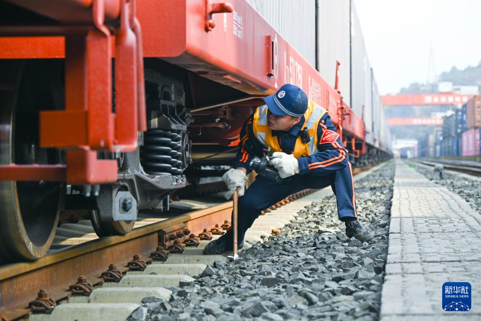 2月15日,在贵阳国际陆港都拉营站,铁路工作人员进行列检作业。新华社发(邵健 摄)