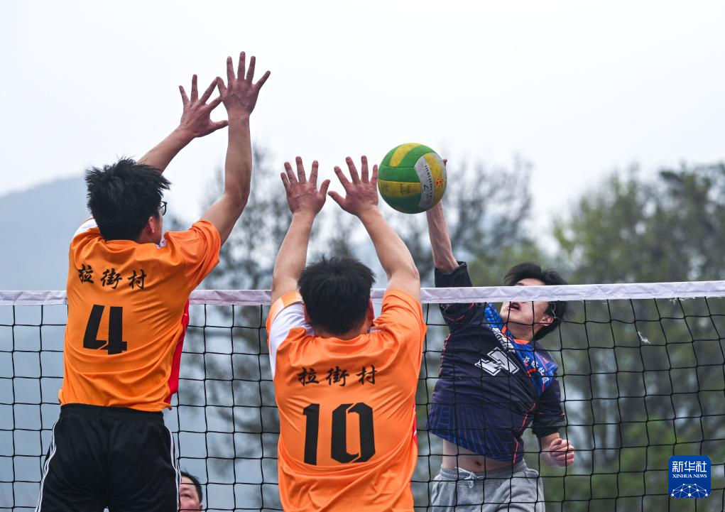 2月21日,拉街茯苓队球员与古榕社区队球员(右)在“村排”比赛中。新华社记者 杨文斌 摄