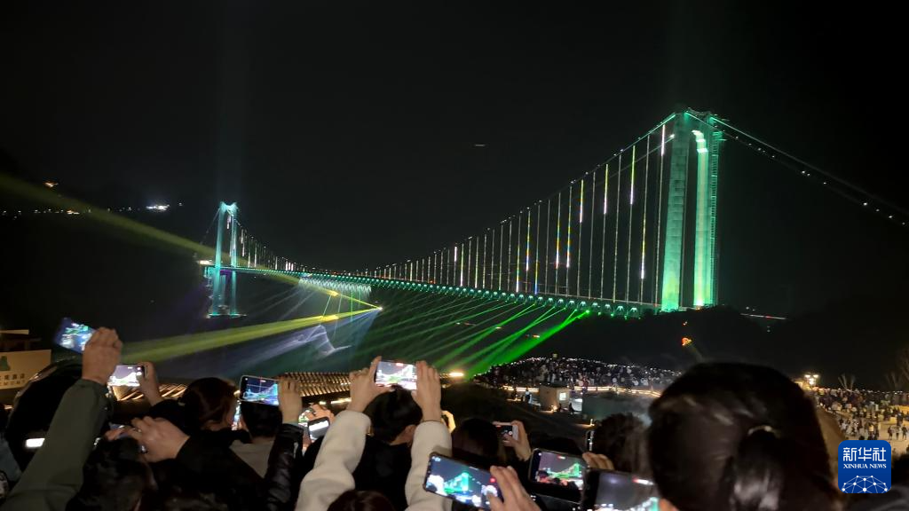 “与家人共赏美景,心中满是幸福。”夜晚,观看完以高桥为“幕布”的大型水幕灯光秀,四川游客万金林不由得感叹。