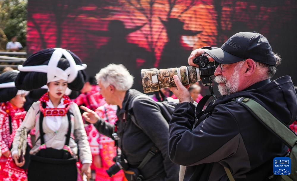 2月26日,在贵州省六盘水市六枝特区梭戛苗族彝族回族乡高兴村跳花场,国外游客在拍照。新华社记者 陶亮 摄