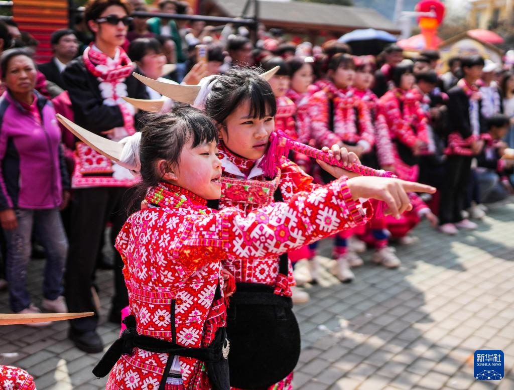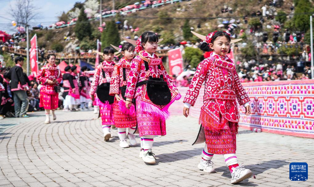 2月26日,在贵州省六盘水市六枝特区梭戛苗族彝族回族乡高兴村跳花场,小朋友们在进行巡游。新华社记者 陶亮 摄
