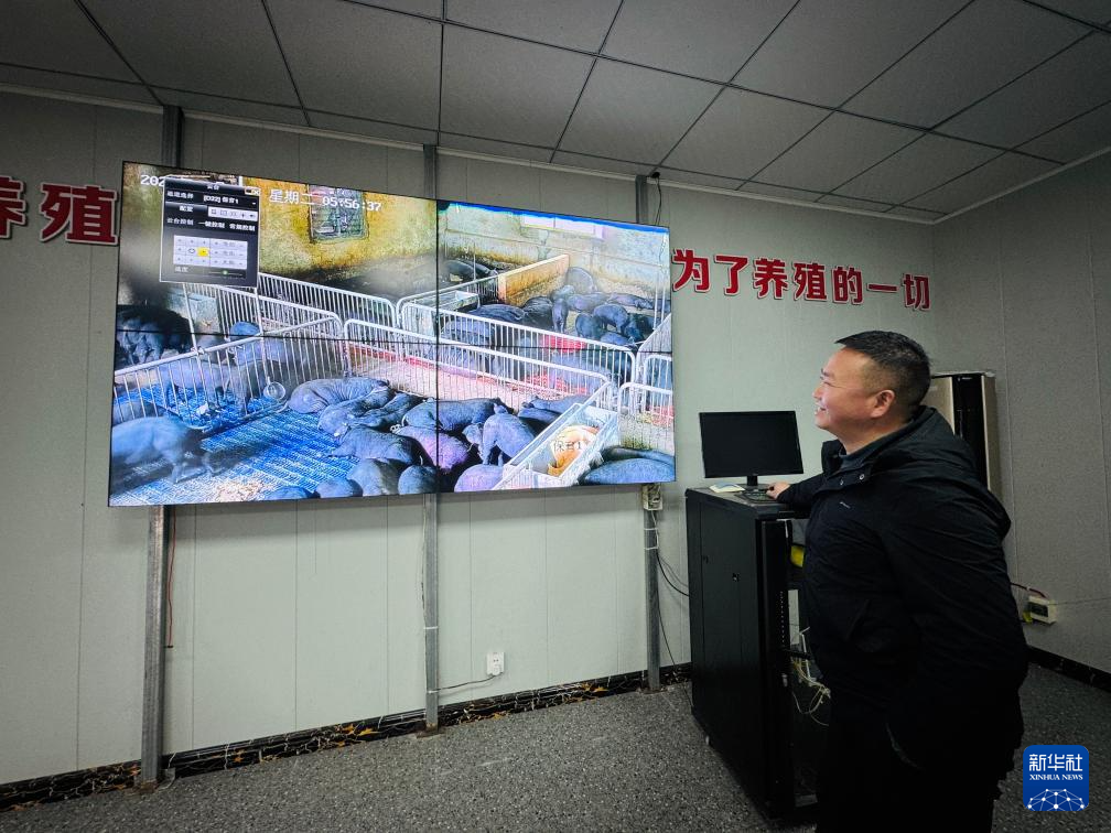 2026年2月10日,郑培坤查看智能化生猪养殖基地的猪舍监控。新华社记者 周宣妮 摄