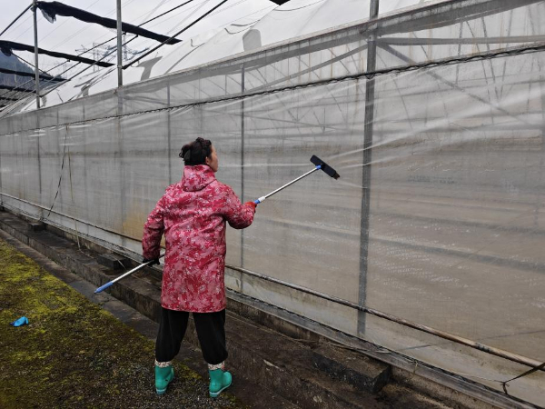 图为育苗专业户对大棚进行管护。