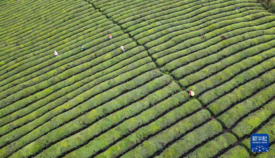 3月20日,茶农在贵州省遵义市余庆县龙溪镇的茶叶基地采茶(无人机照片)。新华社发(周磊摄)