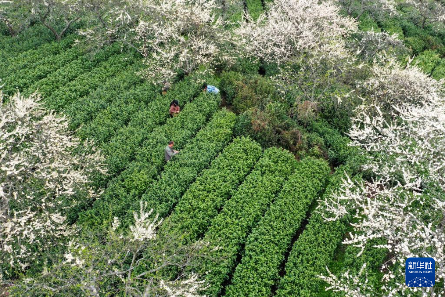 3月21日,村民在贵州省福泉市陆坪镇福兴村茶园采摘春茶。新华社发(肖伟摄)