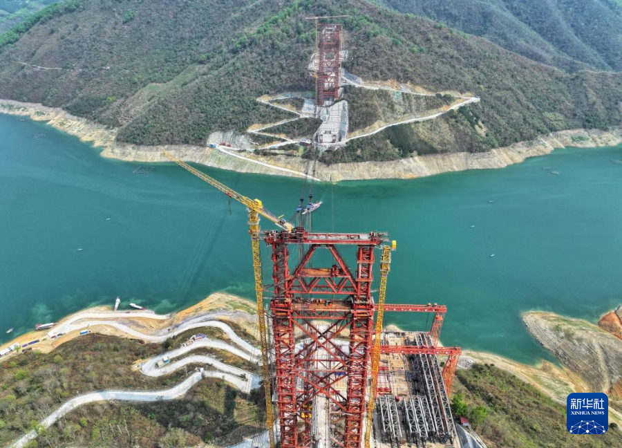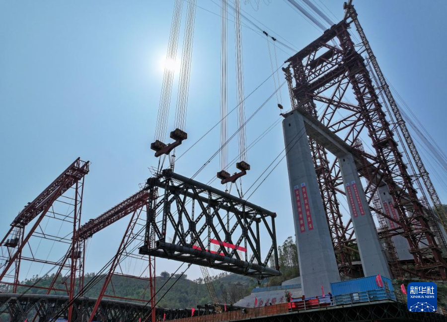 3月21日,黄百铁路红水河铁路大桥首节拱肋在进行吊装(无人机照片)。新华社记者 刘续