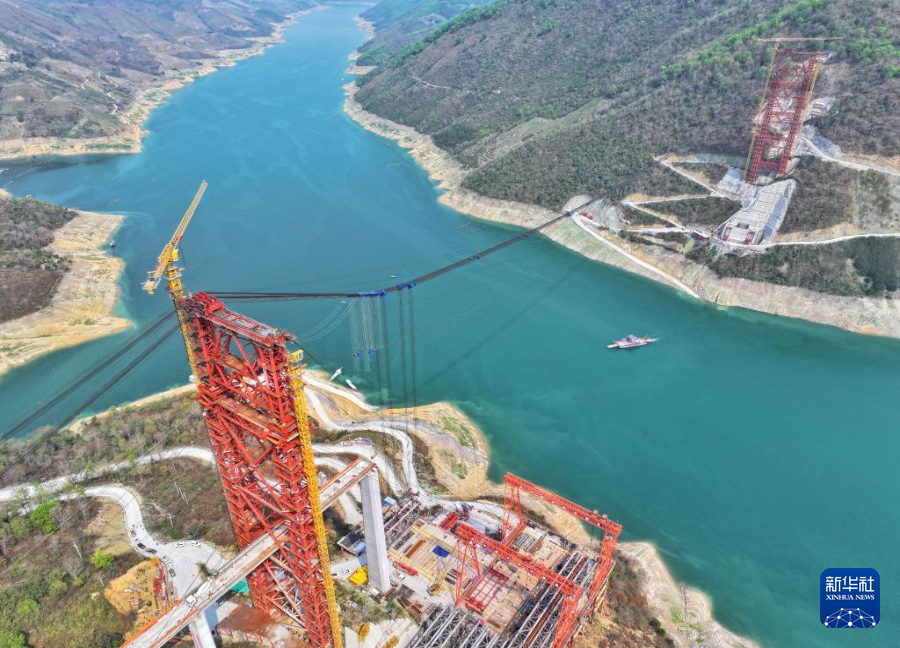 3月21日,黄百铁路红水河铁路大桥首节拱肋在进行吊装(无人机照片)。新华社记者 刘续 摄